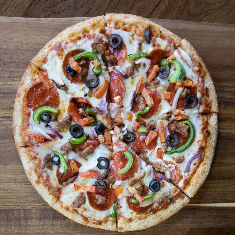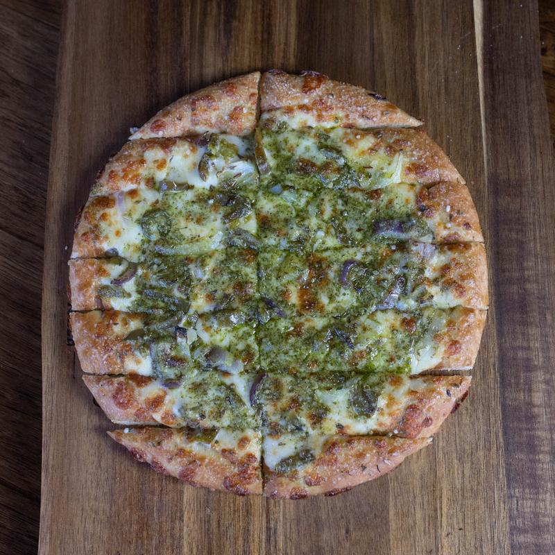 Sauces: Marinara | Alfredo | Buttermilk Ranch | Barbeque | Basil Pesto • Toppings: Meats (Chicken, pepperoni, sausage, bacon, salami, beef, and ham) | Veggies (onions, green pepper, garlic, mushrooms, artichoke hearts, olives, Roma tomatoes, pineapple, jalapenos, and feta cheese)